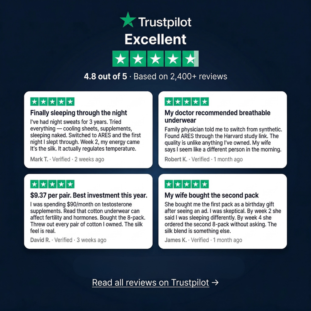 The silk-blend lining releases heat instead of trapping it. Your body stops fighting the fabric. Deep sleep where 70% of daily testosterone is produced finally happens uninterrupted.