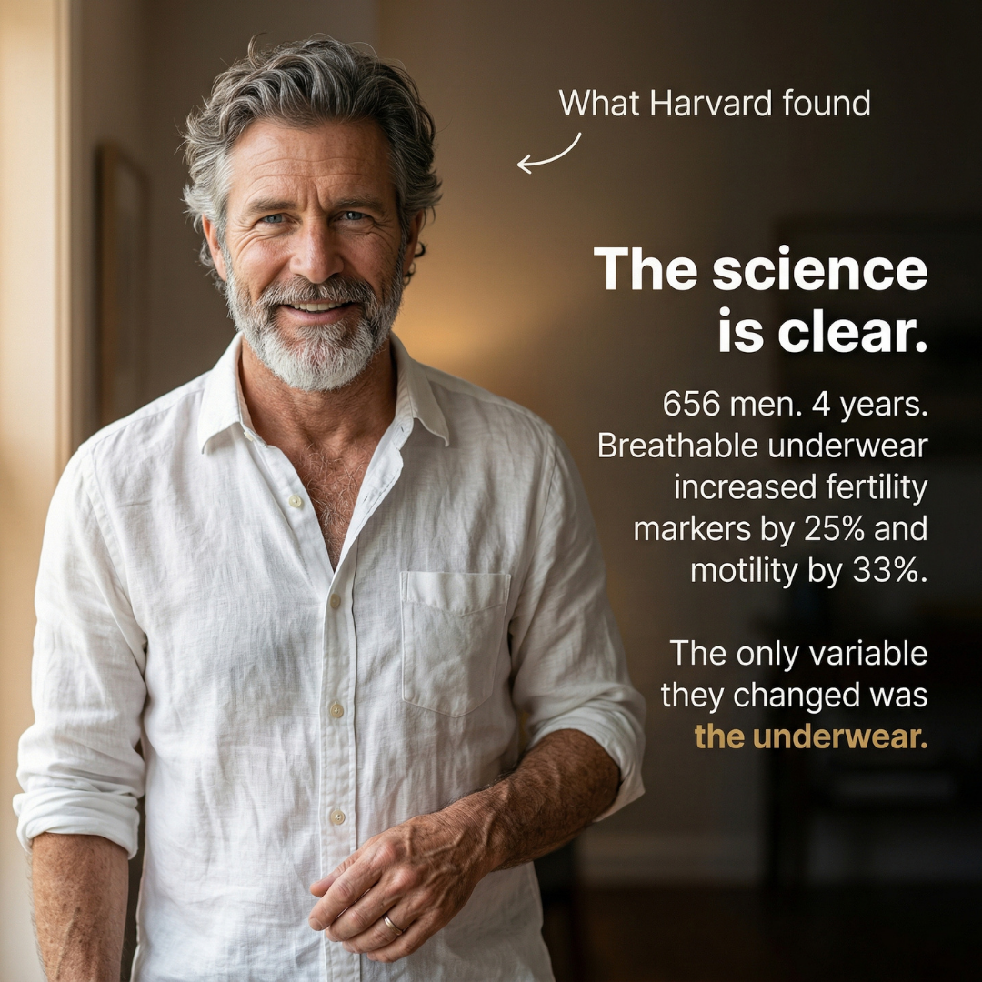 Harvard documented it: breathable underwear = 25% higher sperm concentration, 14% lower testicular stress. (Human Reproduction, 2018, N=656)